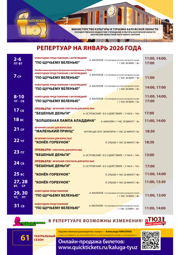 На главную > Новости > Новости > 61-й театральный сезон! Репертуар Калужского ТЮЗа на январь 2026 года