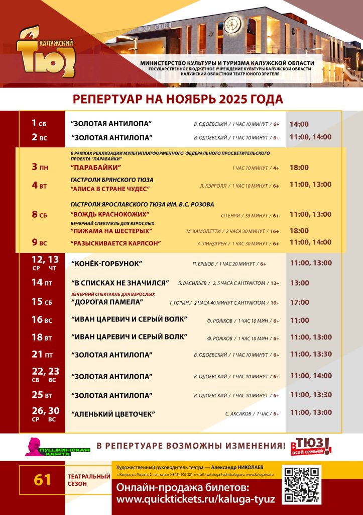 61-й театральный сезон! Репертуар Калужского ТЮЗа на ноябрь 2025 года
